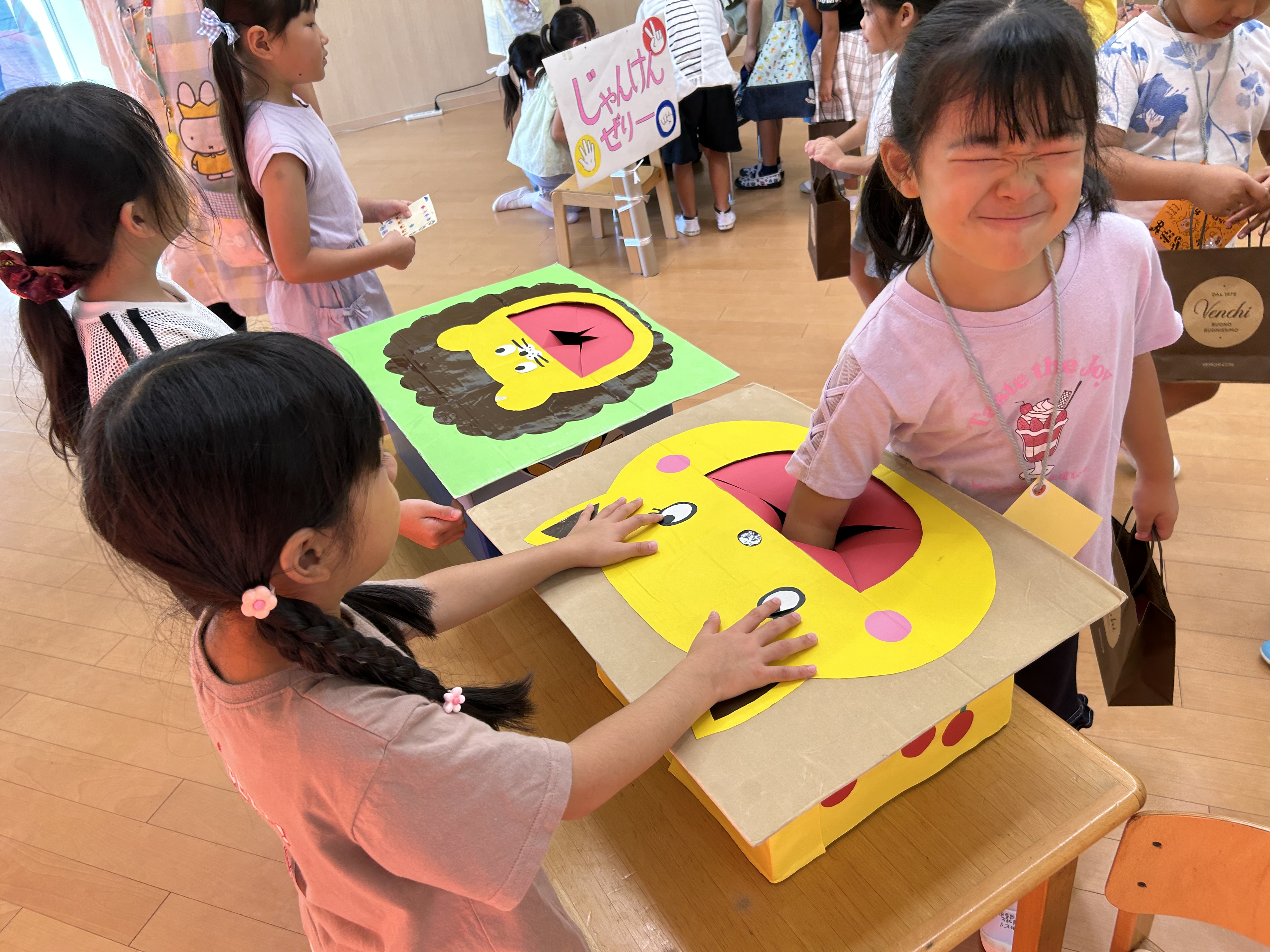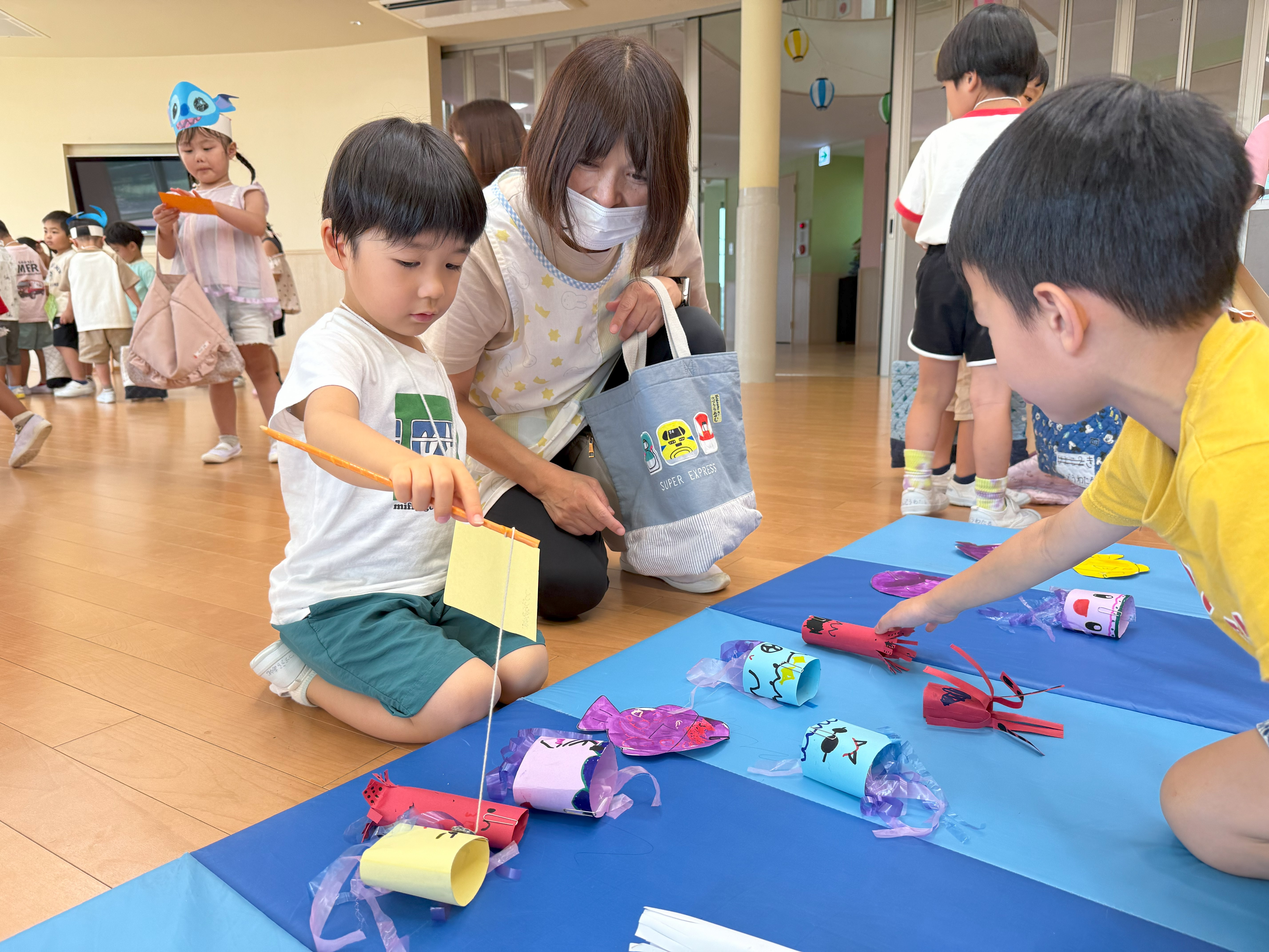 夏期保育では、年長さんが中心となって「縁日遊び」を企画し、お店屋さんになってお友だちを迎えてくれました。魚釣りやおもちゃくじなど、工夫いっぱいのゲームに年少さんや年中さん(未就園児)も大喜び!年長さんの頼もしい姿と、みんなで楽しむひとときが、とても印象的でした。