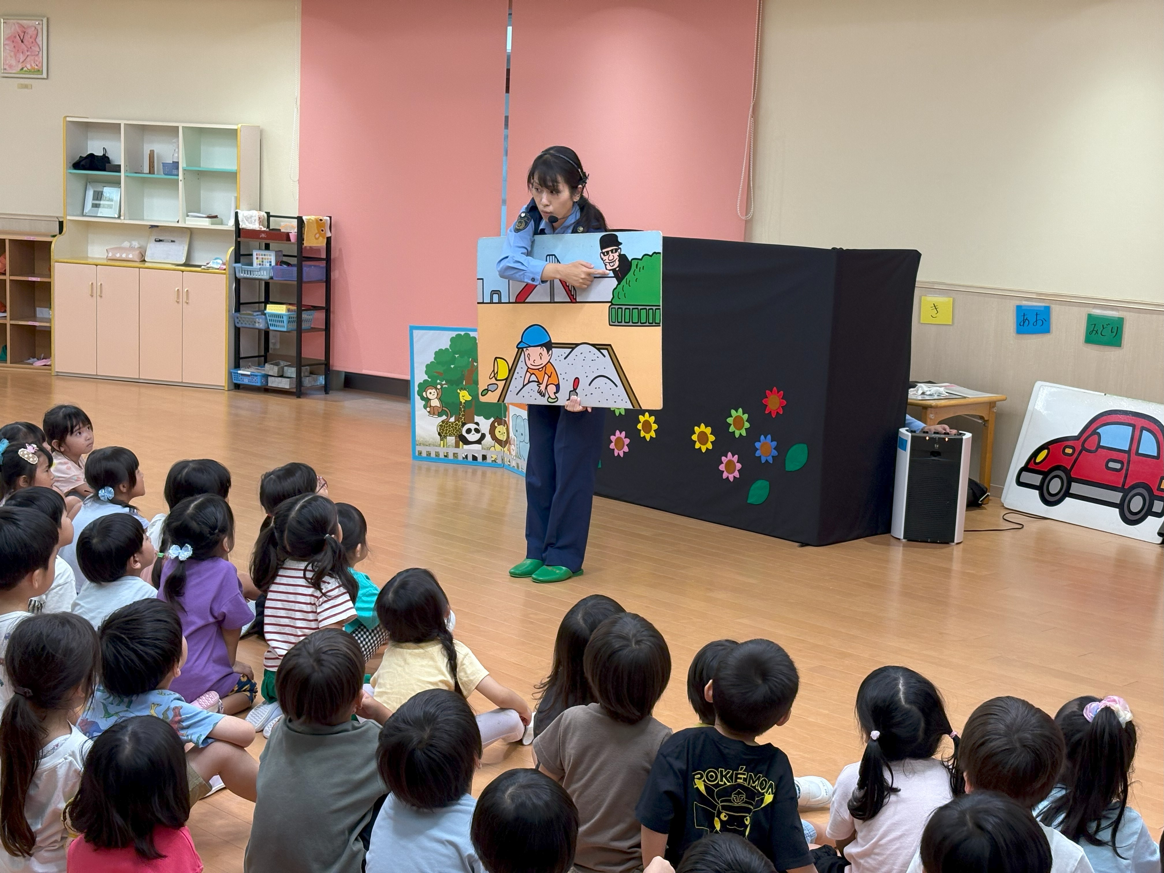 また、5日に行われた防犯教室では埼玉県警「ひまわり」の方々が来園し、人形劇やお話を通して、子どもたちに防犯の大切さをわかりやすく伝えてくださいました。特に「知らない人にはついていかない」という約束を子どもたち自身がしっかり口にし、真剣な表情で学ぶ姿が見られました。