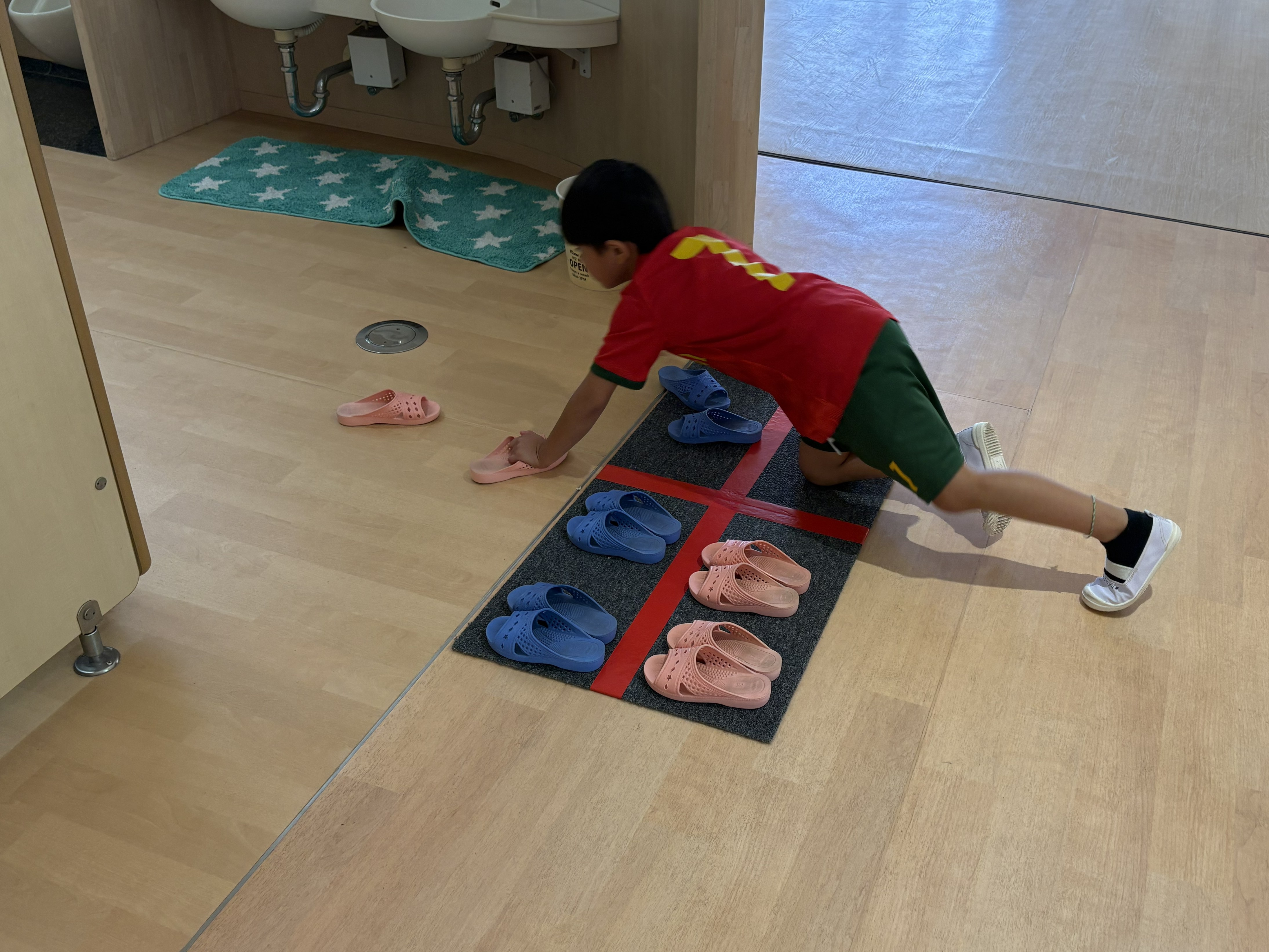 トイレのスリッパ(サンダル)、使った後にくるっと向きを変えて並べる。これは園でもお家でも大切にしているマナーの一つですね。でも、年長さんの中には、自分の使ったサンダルだけでなく、誰かが脱ぎっぱなしにして乱れているサンダルまで、そっと直してくれているお友達がいます。
